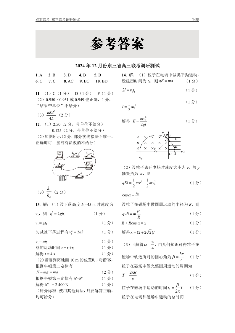 东北三省2025届高三上学期12月调研测试物理答案