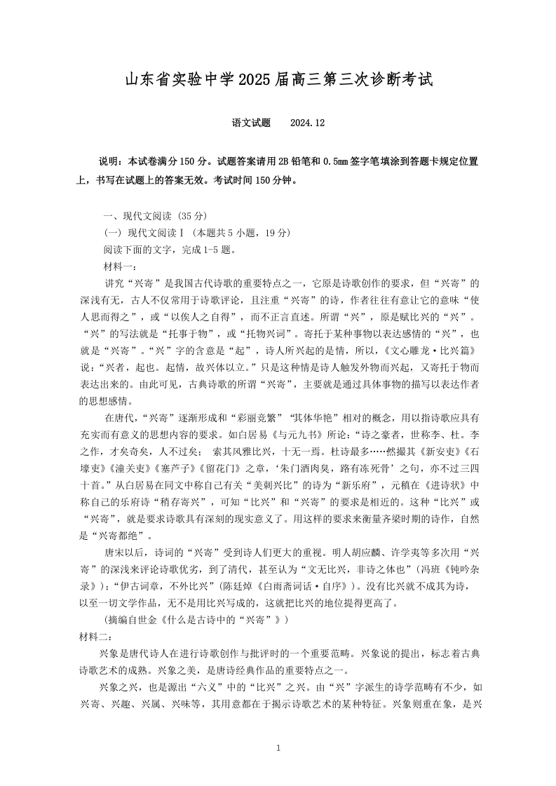 山东省实验中学2025届高三年级第三次诊断考试语文