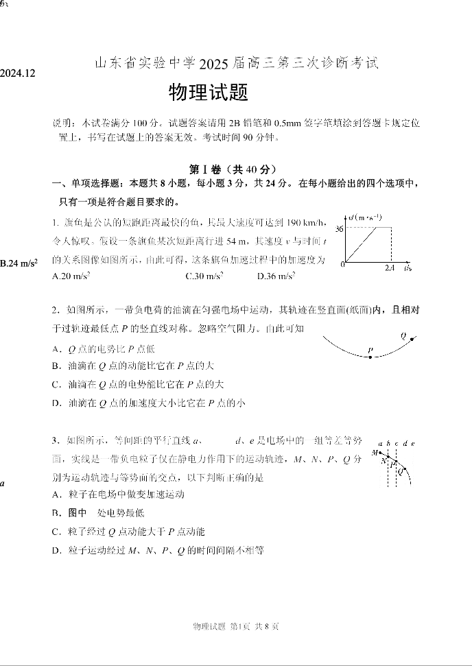 山东省实验中学2025届高三年级第三次诊断考试物理
