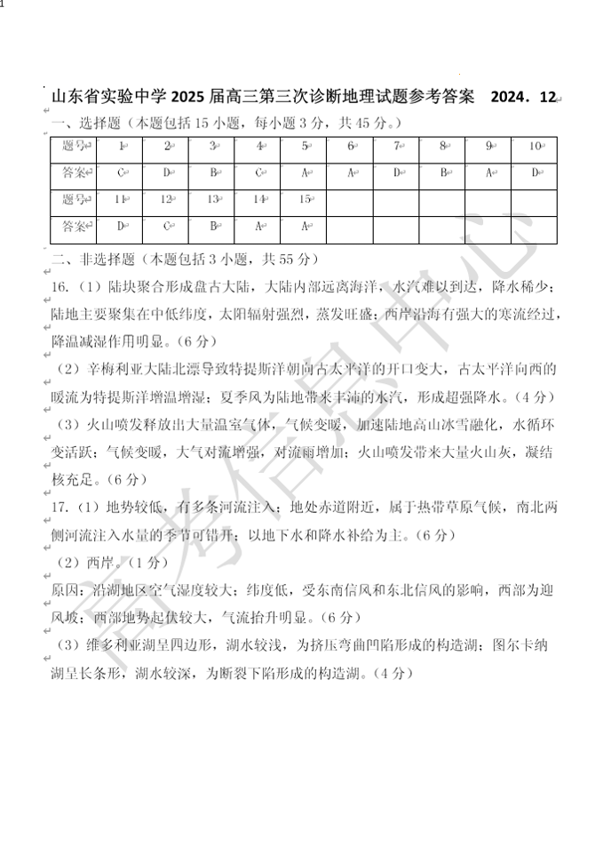 山东省实验中学2025届高三年级第三次诊断考试地理答案