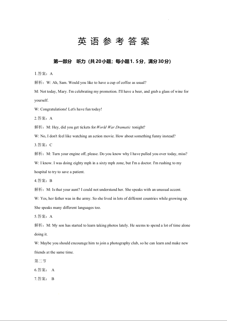 河南省焦作市博爱一中2023.9高三年级开学定位考试英语答案