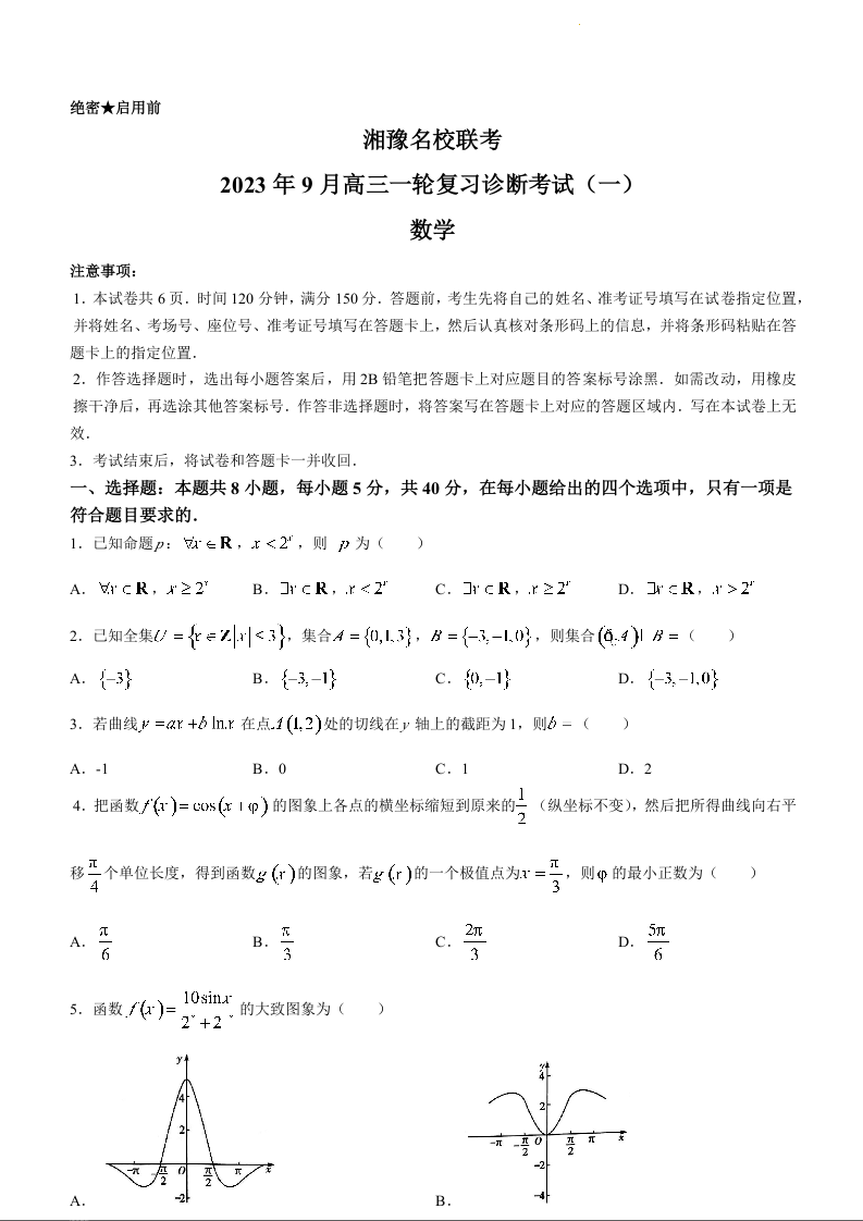 河南省湘豫名校2024.9高三年级联合月考试题数学+答案