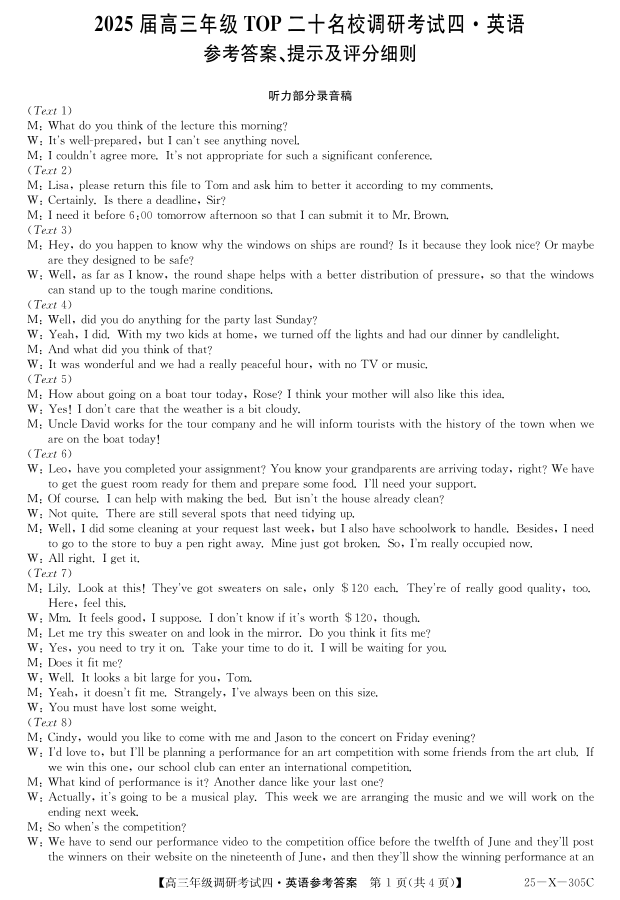 河南省TOP二十名校2025届高三上学期12月调研考试(四)英语答案