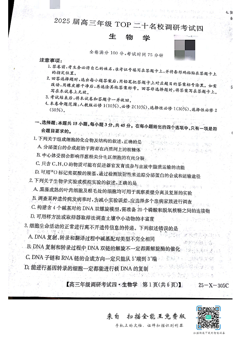 河南省TOP二十名校2025届高三上学期12月调研考试(四)生物