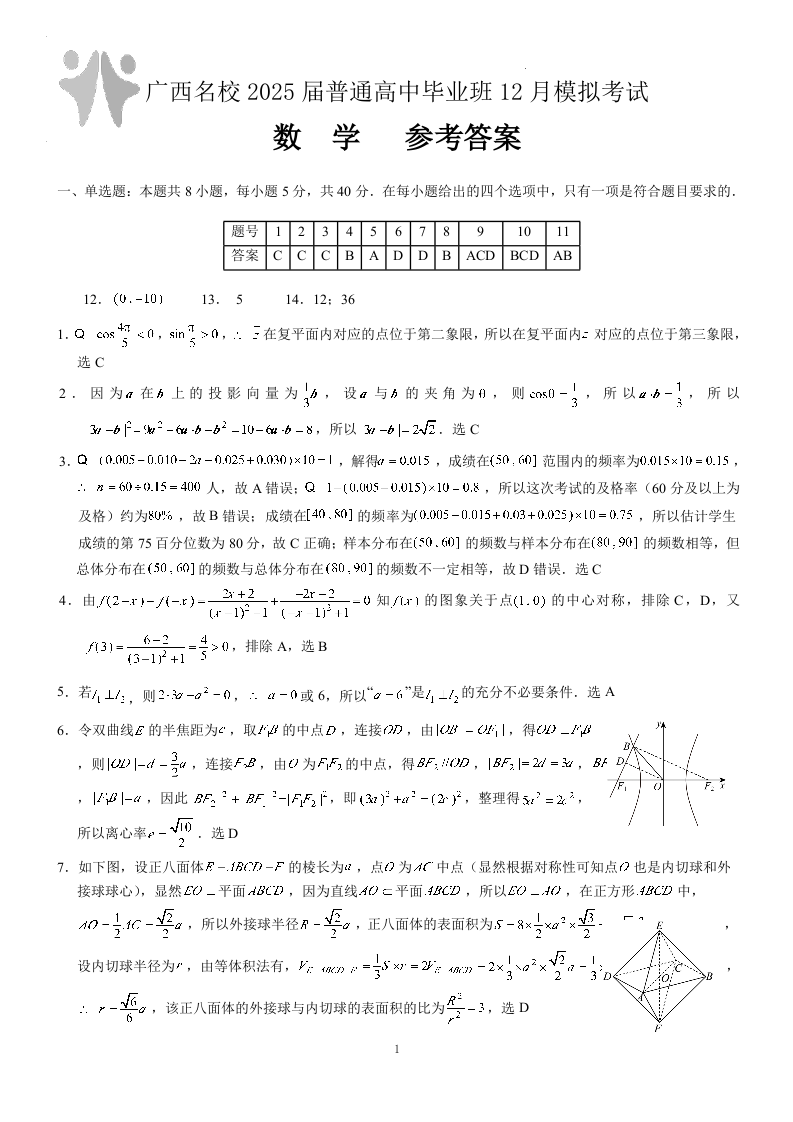 广西省贵港市名校2025届普通高中毕业班12月模拟考试数学答案