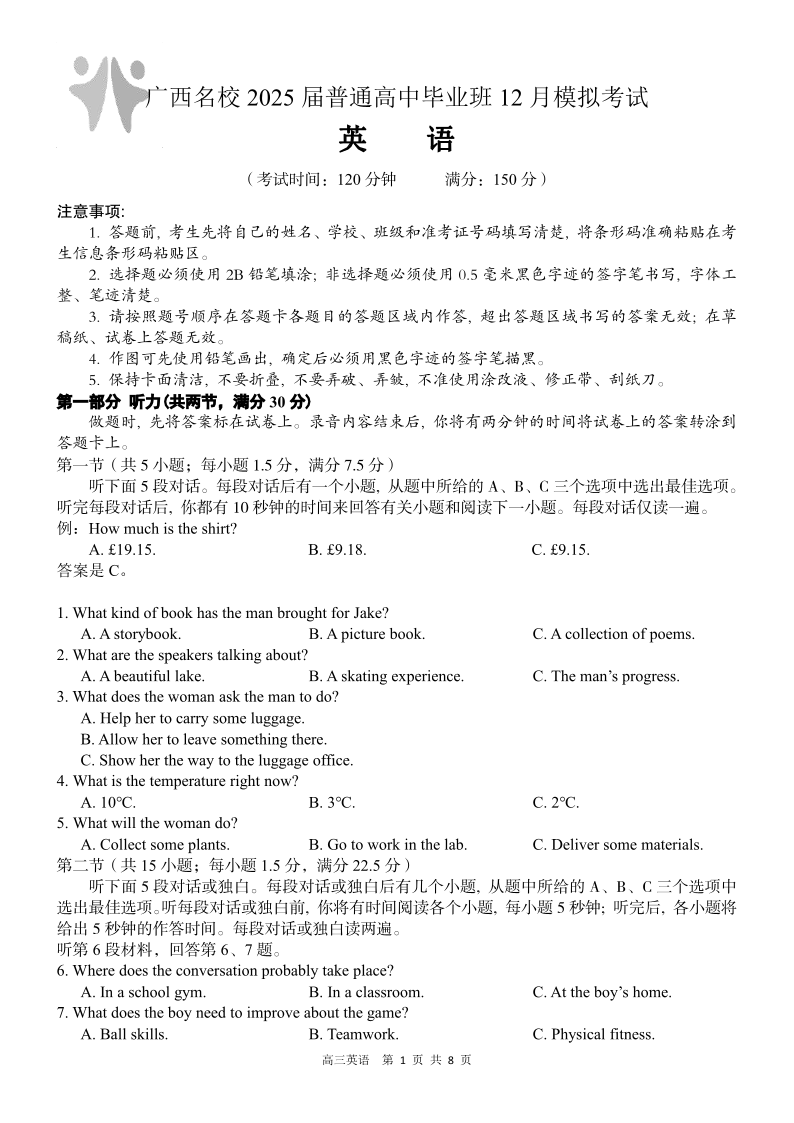 广西省贵港市名校2025届普通高中毕业班12月模拟考试英语