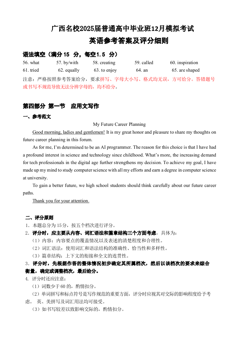 广西省贵港市名校2025届普通高中毕业班12月模拟考试英语评分细则