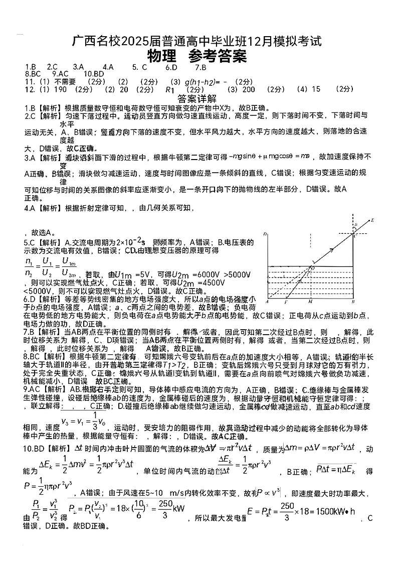 广西省贵港市名校2025届普通高中毕业班12月模拟考试物理答案