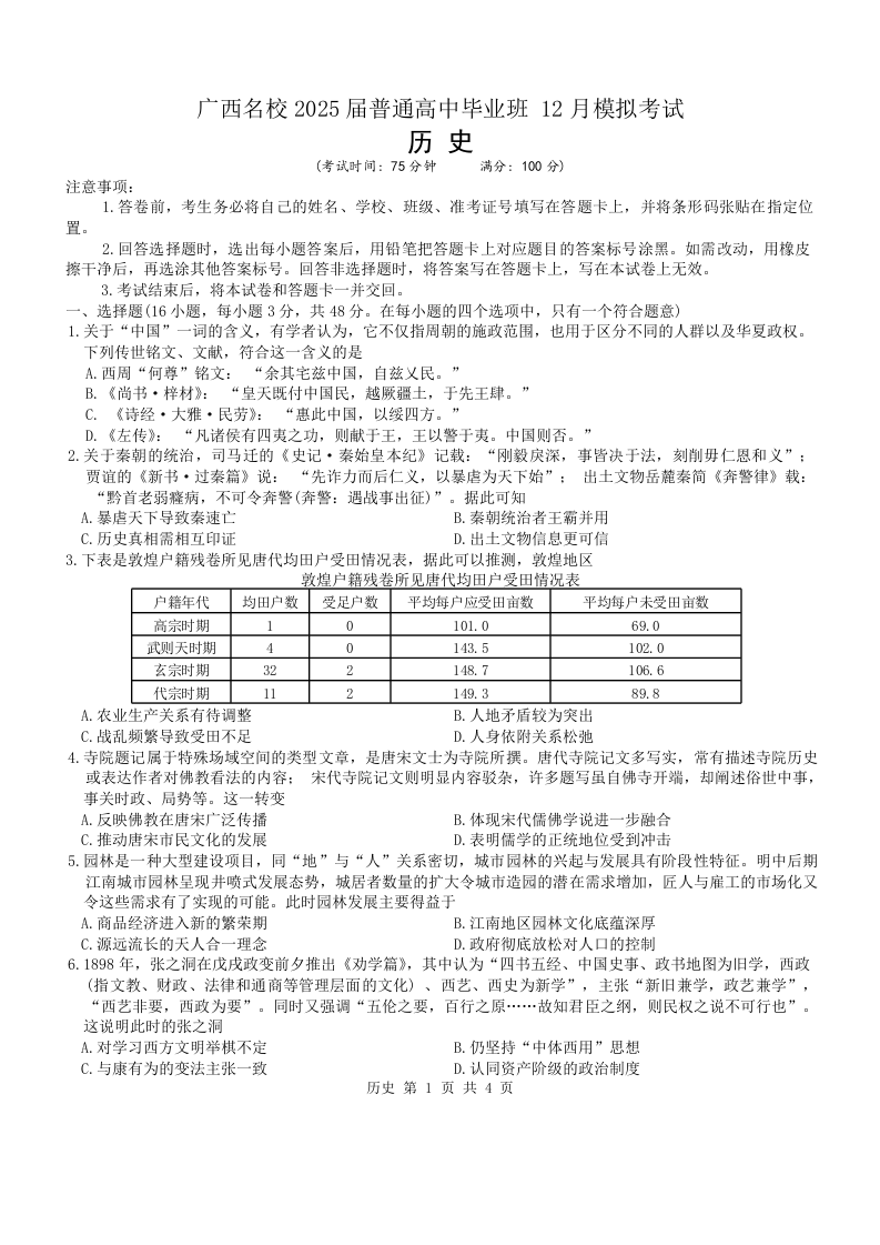 广西省贵港市名校2025届普通高中毕业班12月模拟考试历史
