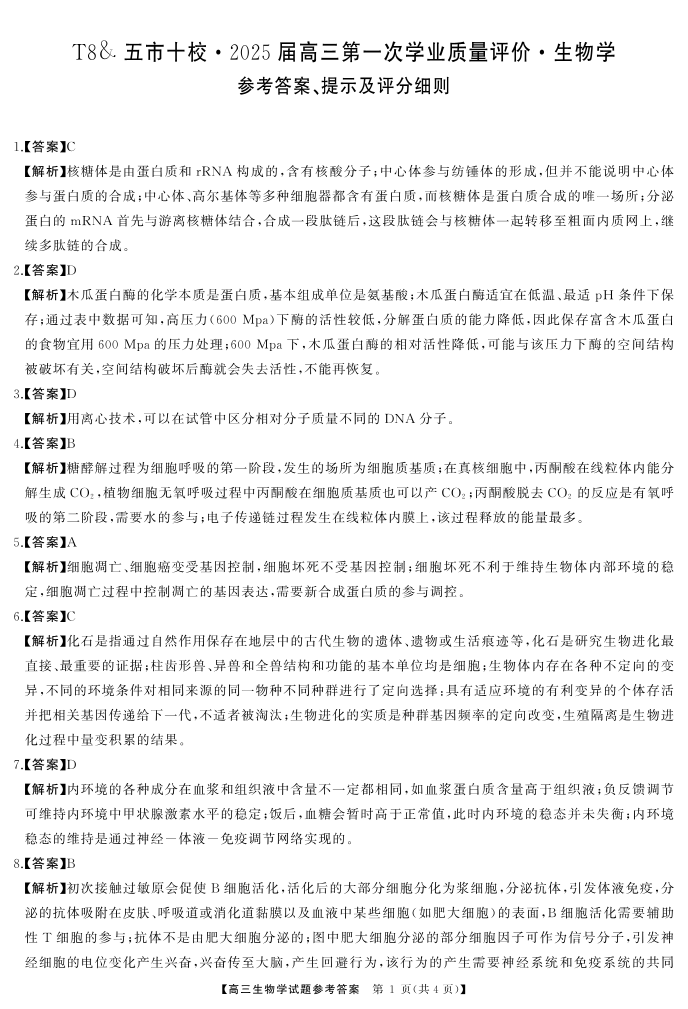 湖南省T8&. 五市十校•2025届高三第一次学业质量评价生物答案