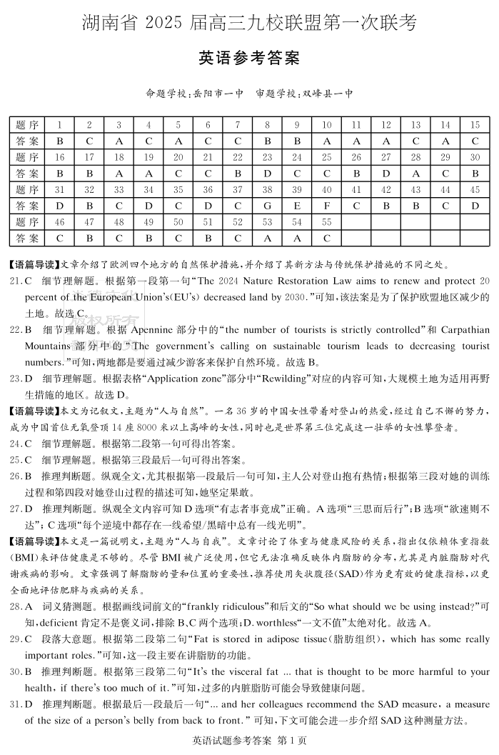 湖南省 2025 届高三九校联盟第一次联考英语答案