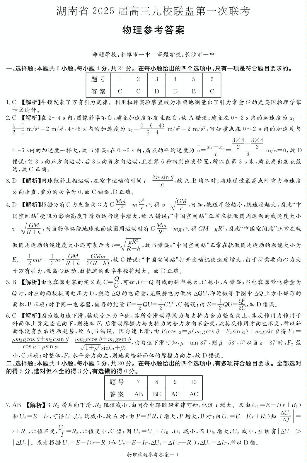 湖南省 2025 届高三九校联盟第一次联考物理答案