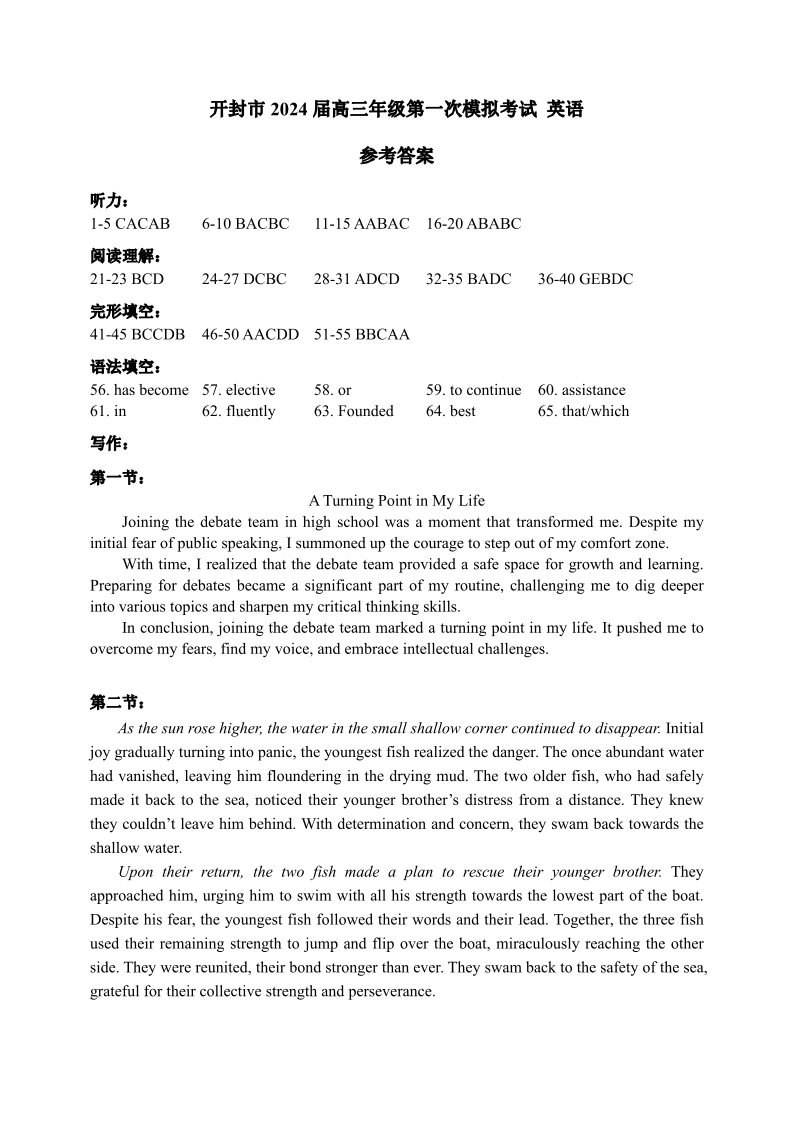 2024届河南省开封市高三上学期第一次模拟考试 英语答案