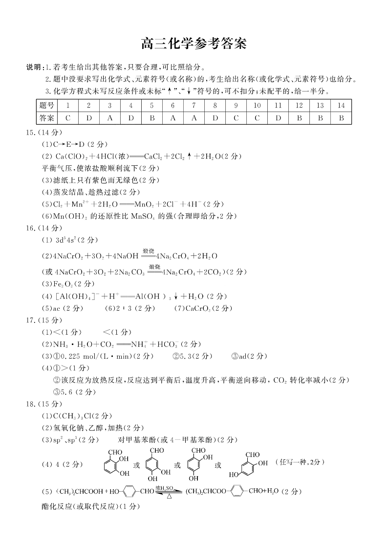 河南省开封市2023.12高三年级第一次模拟考试化学答案