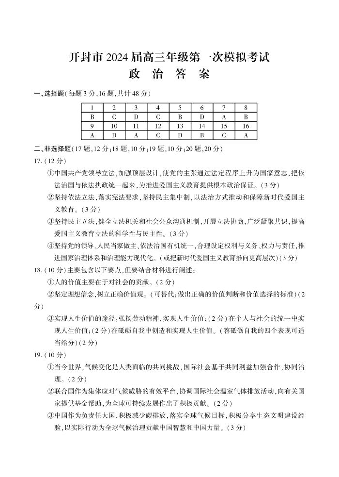 河南省开封市2023.12高三年级第一次模拟考试政治答案