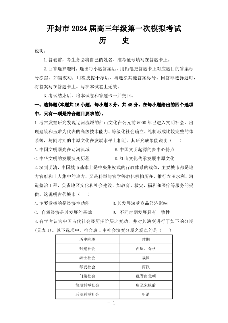 河南省开封市2023.12高三年级第一次模拟考试历史