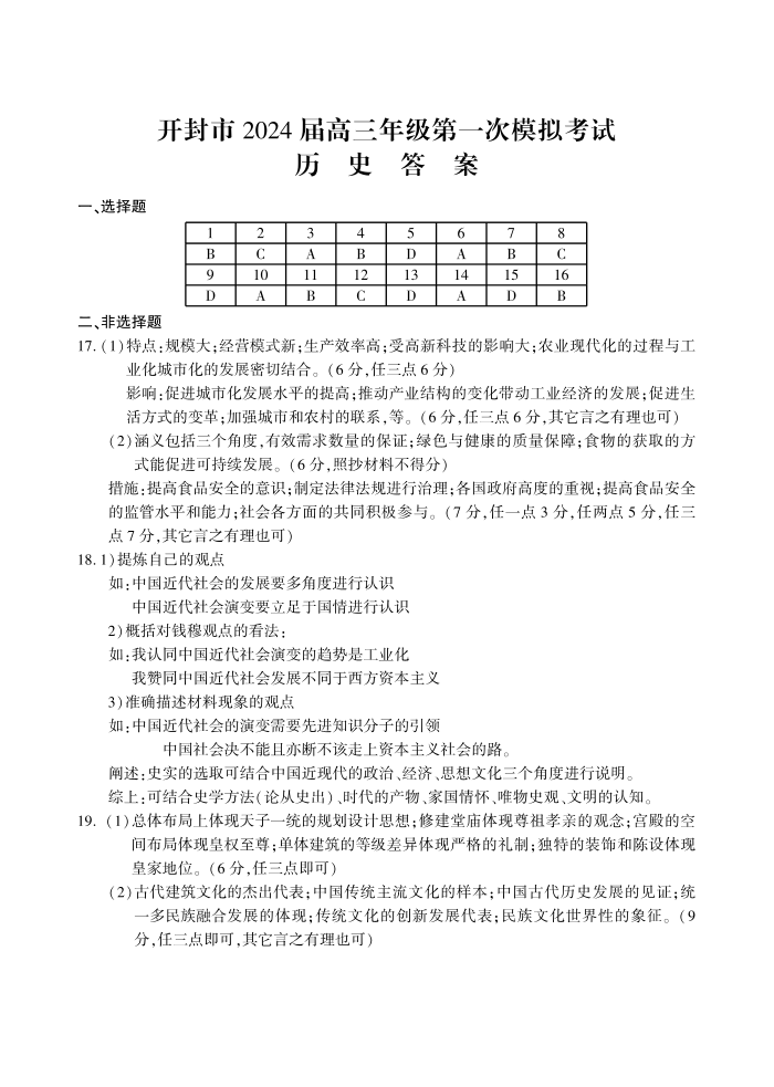 河南省开封市2023.12高三年级第一次模拟考试历史答案