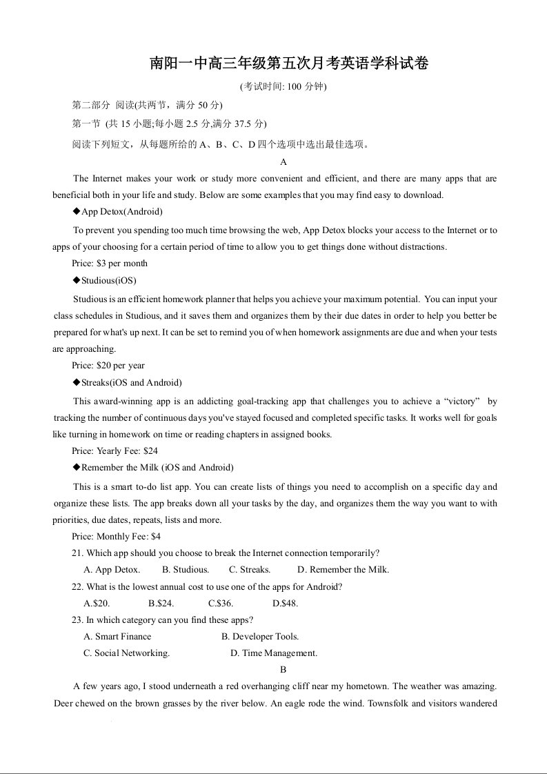 河南省南阳市第一中学2023.12高三年级第五次月考英语