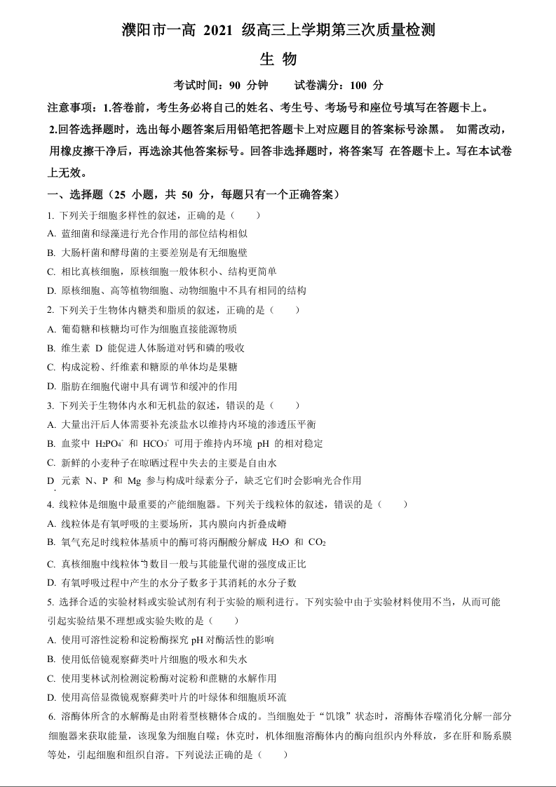 河南省濮阳市第一高级中学2024届高三上学期第三次质量检测生物+答案解析