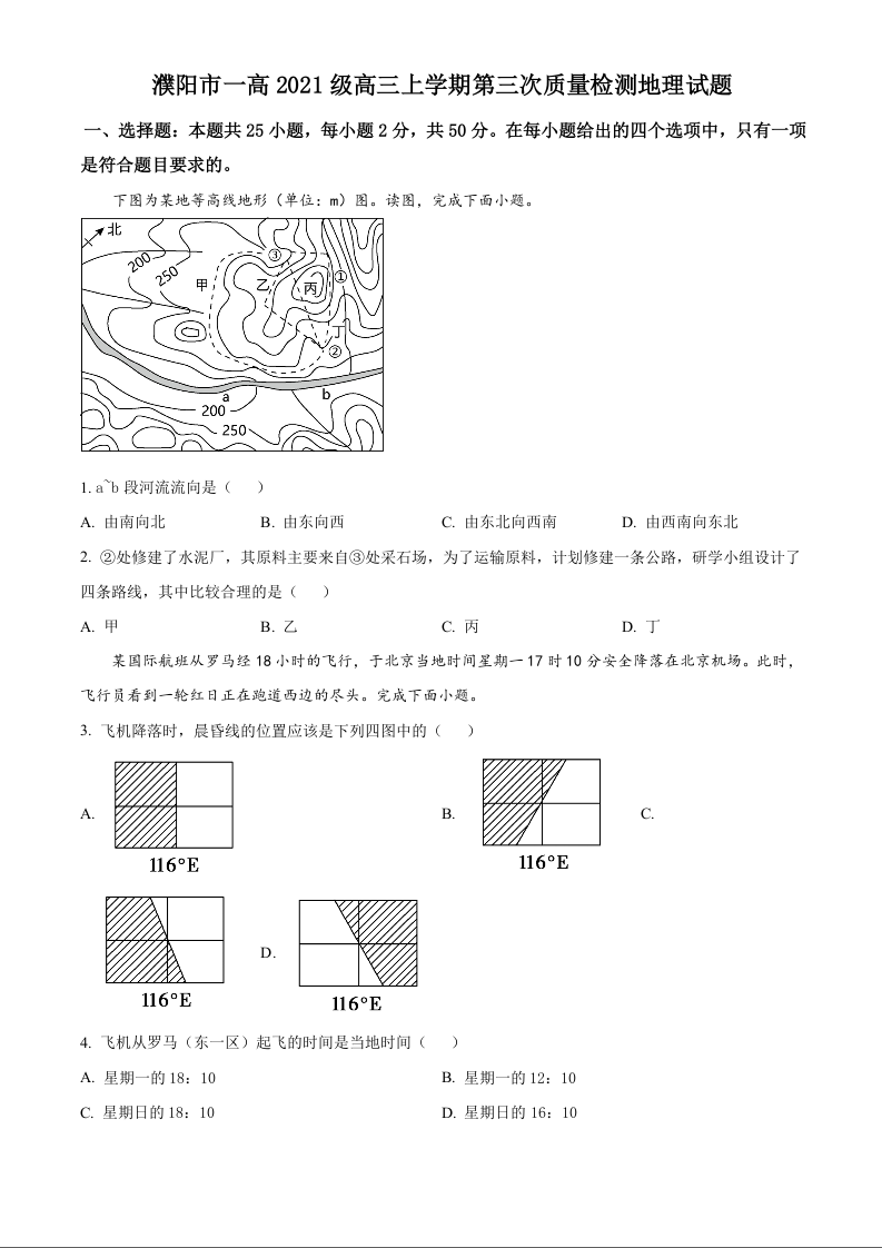 河南省濮阳市第一高级中学2024届高三上学期第三次质量检测地理+答案解析