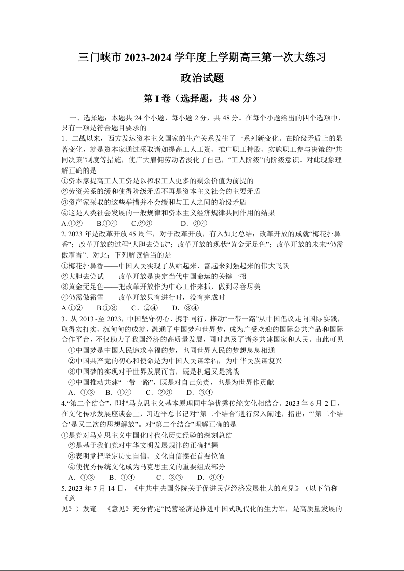 河南省三门峡市2024届高三上学期第一次大练习政治+答案