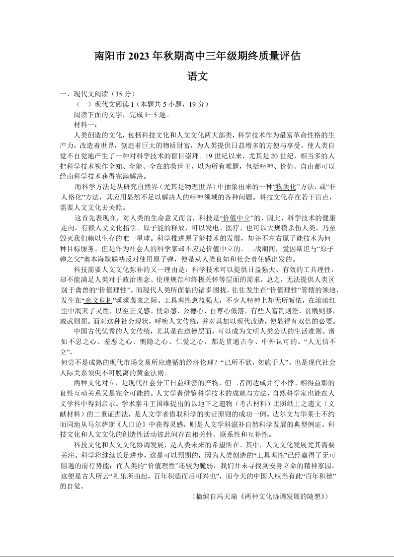 河南省南阳市2024届高三上学期1月期终质量评估语文+答案