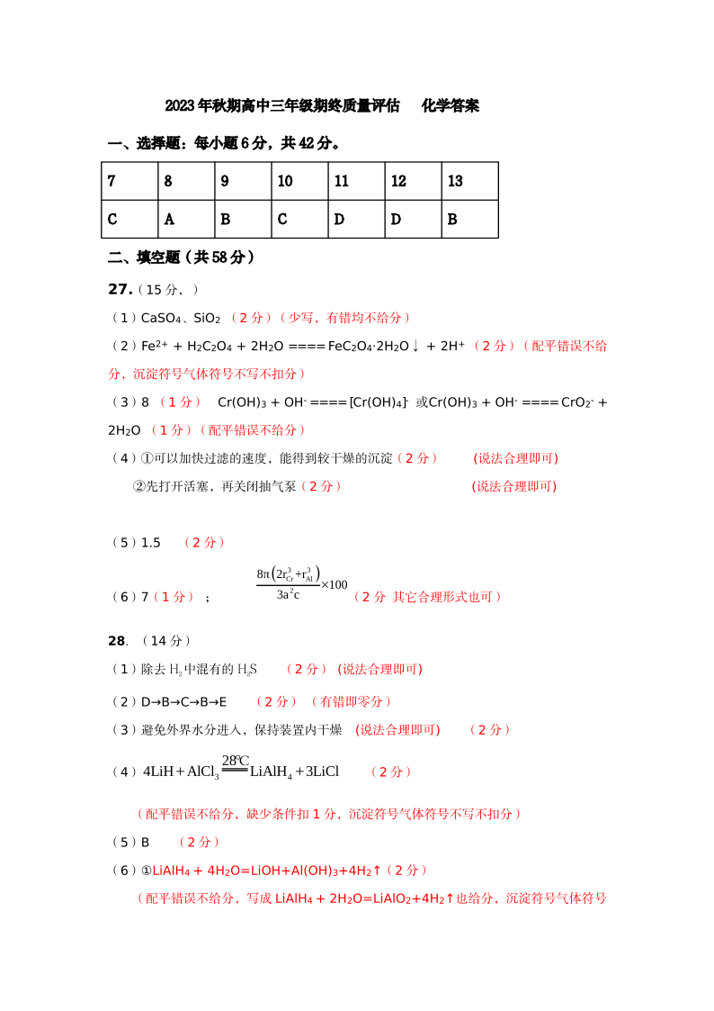 河南省南阳市2024届高三上学期1月期终质量评估化学答案