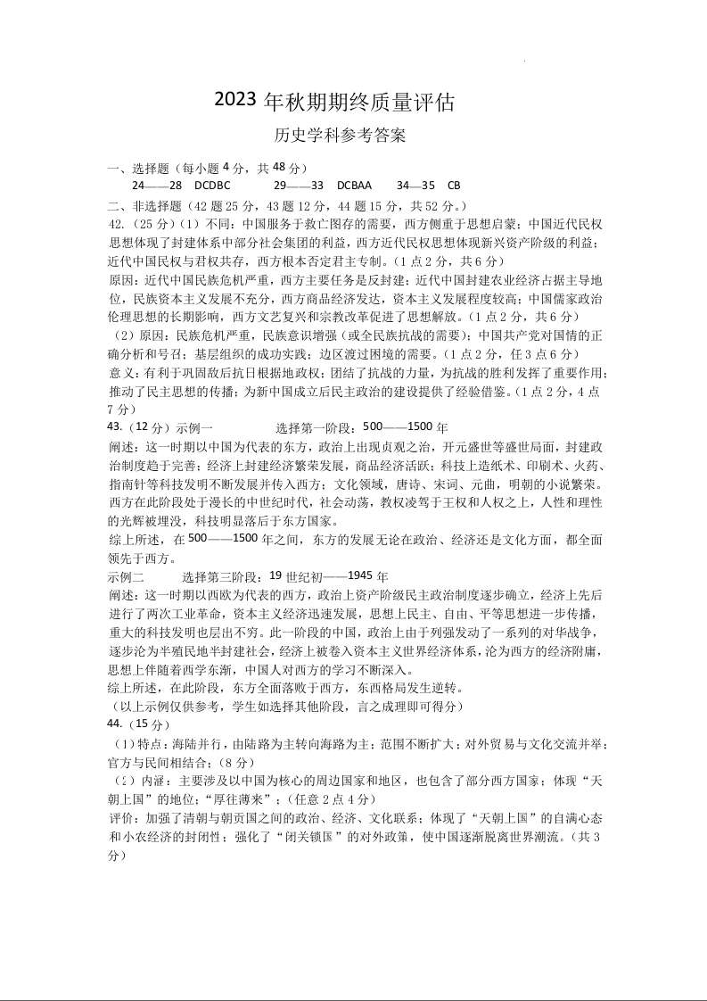 河南省南阳市2024届高三上学期1月期终质量评估历史答案