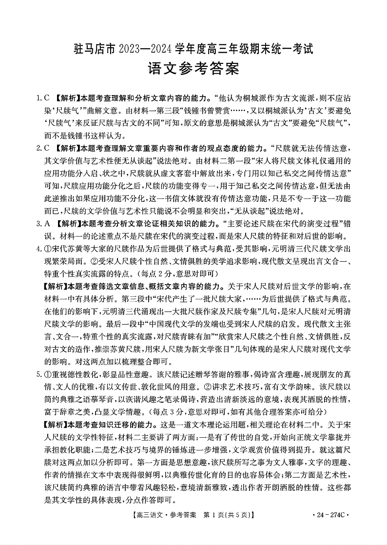 河南省驻马店市2023-2024学年高三上学期期末考试语文答案