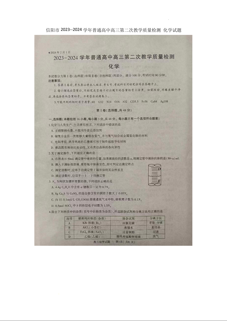 河南省信阳市2024届高三上学期第二次教学质量检测(二模)化学