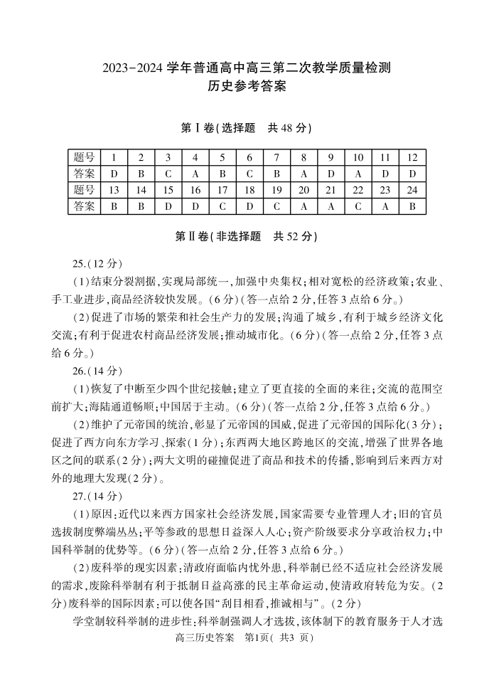 河南省信阳市2023--2024学年普通高中高三第二次教学质量检测历史答案