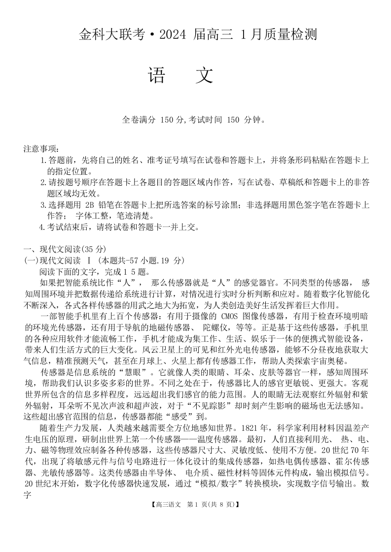 2024届河南省金科大联考高三上学期1月质量检测语文