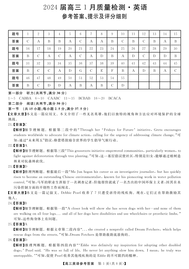 2024届河南省金科大联考高三上学期1月质量检测英语答案