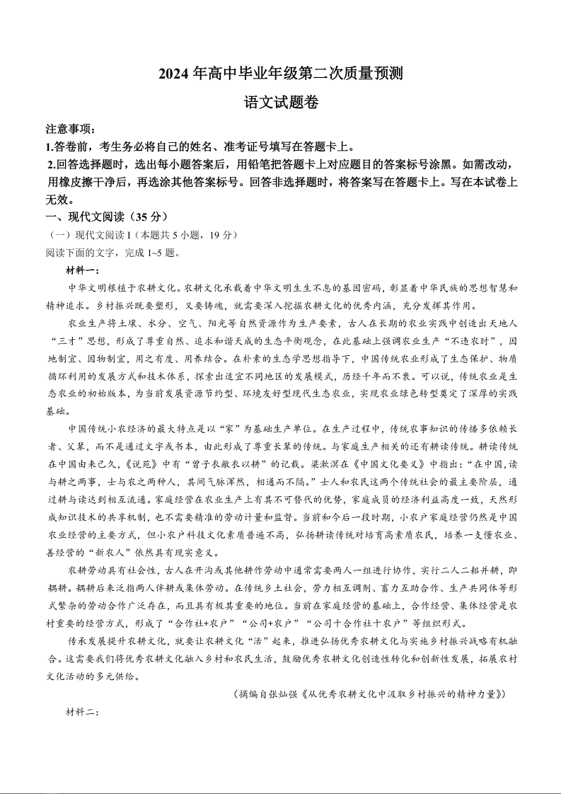 2024届河南省郑州市周口市高三下学期第二次质量预测语文+答案