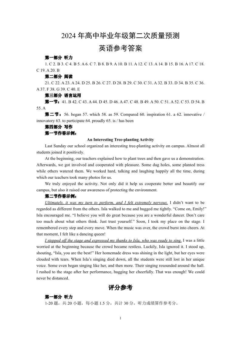2024届河南省郑州市周口市高三下学期第二次质量预测英语答案