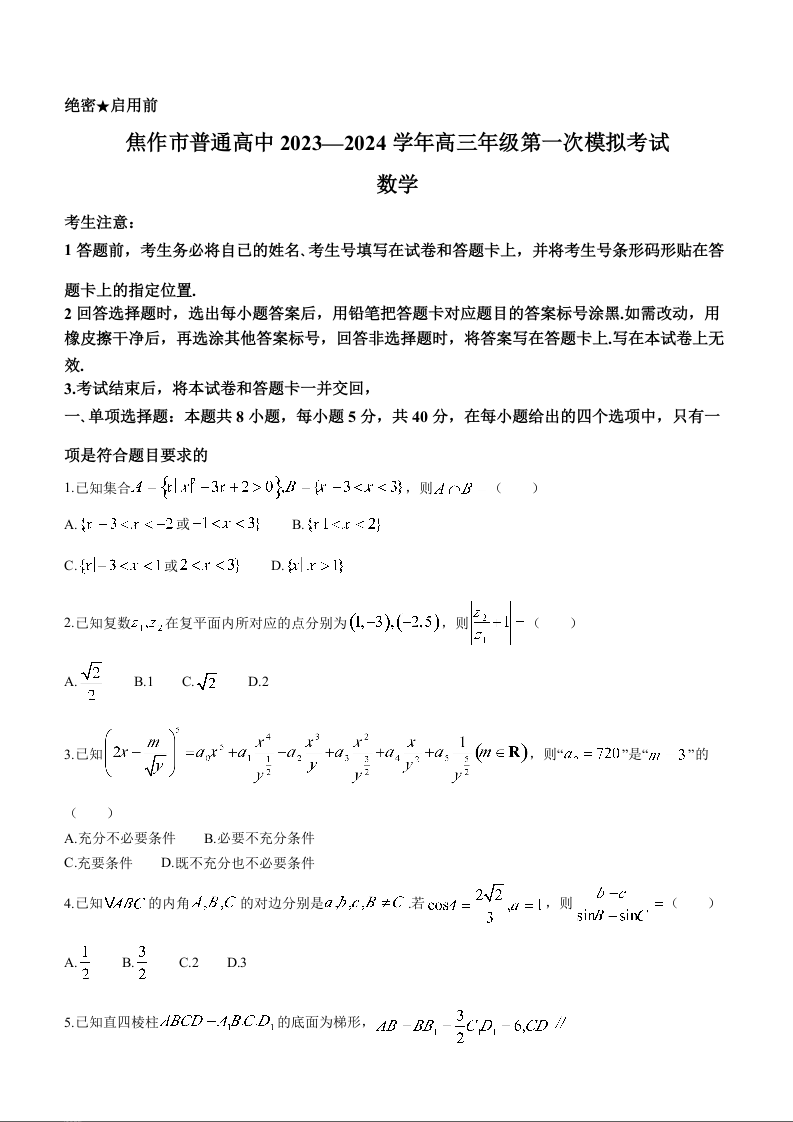 河南省四市2024届高三3月联考(焦作濮阳安阳鹤壁二模)数学+答案