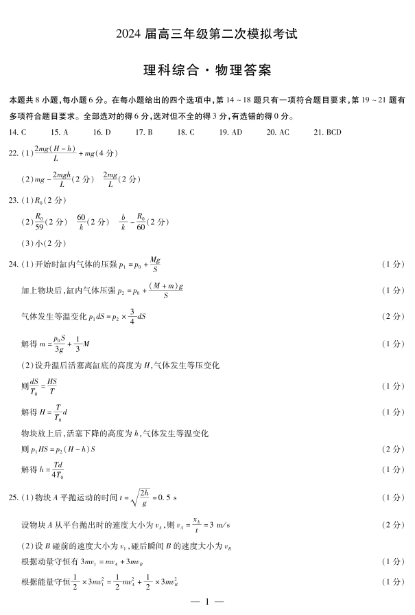 河南省四市2024届高三3月联考(焦作濮阳安阳鹤壁二模)物理简易答案