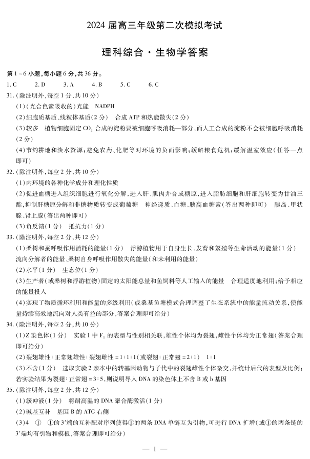 河南省四市2024届高三3月联考(焦作濮阳安阳鹤壁二模)生物简易答案