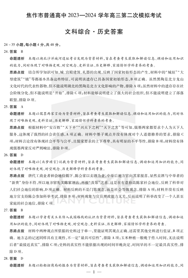 河南省四市2024届高三3月联考(焦作濮阳安阳鹤壁二模)文综历史答案