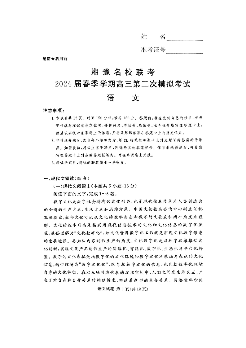 河南省湘豫名校联考2024届高三第二次模拟考试语文