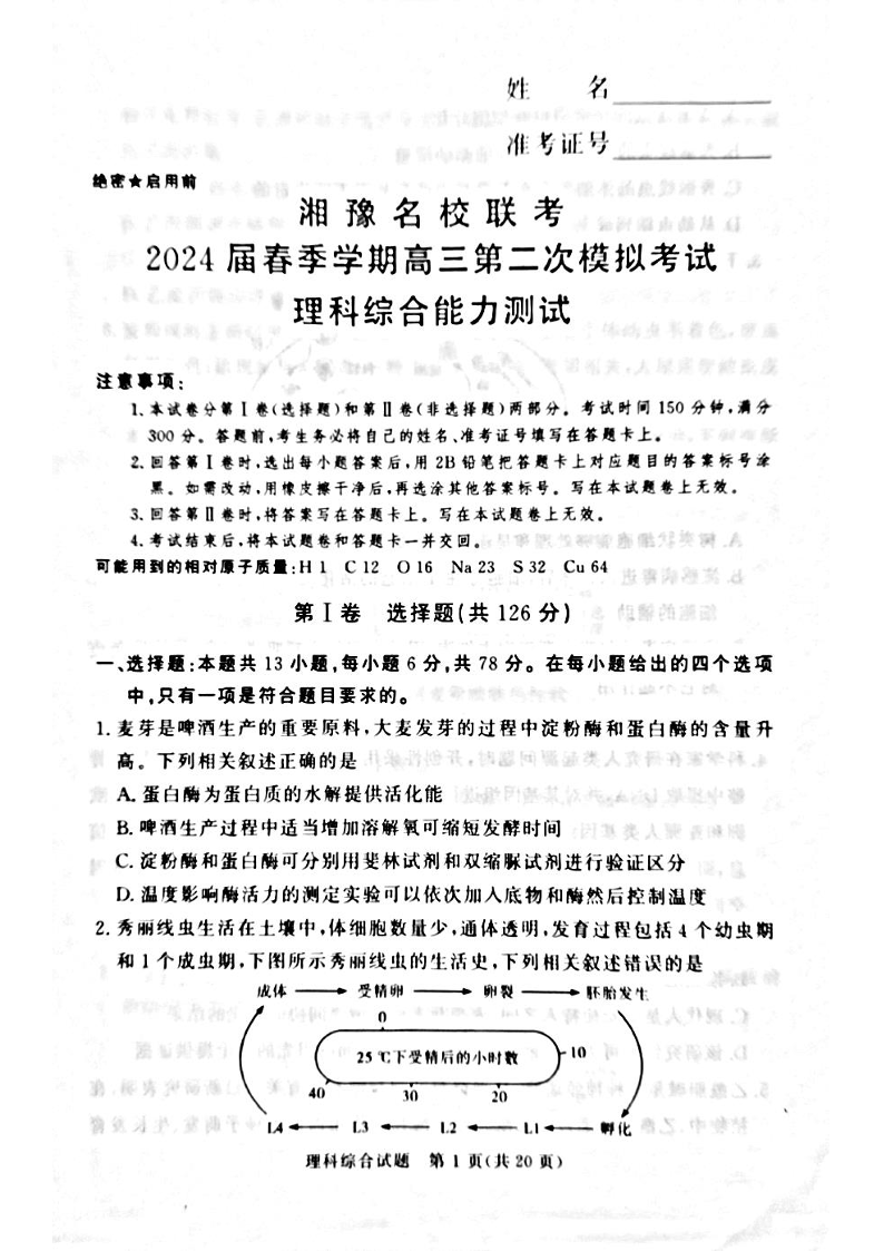 河南省湘豫名校联考2024届高三第二次模拟考试理科综合