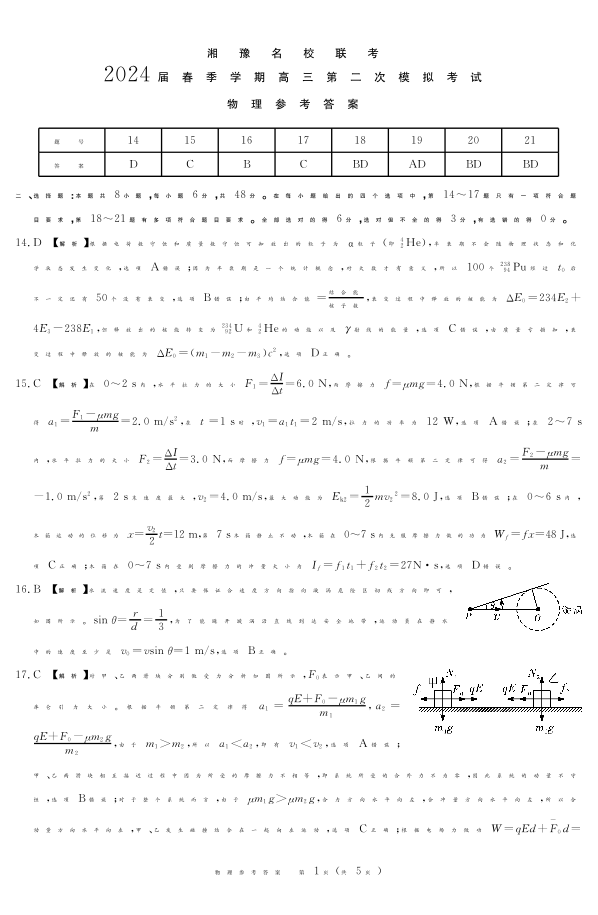 河南省湘豫名校联考2024届高三第二次模拟考试物理答案