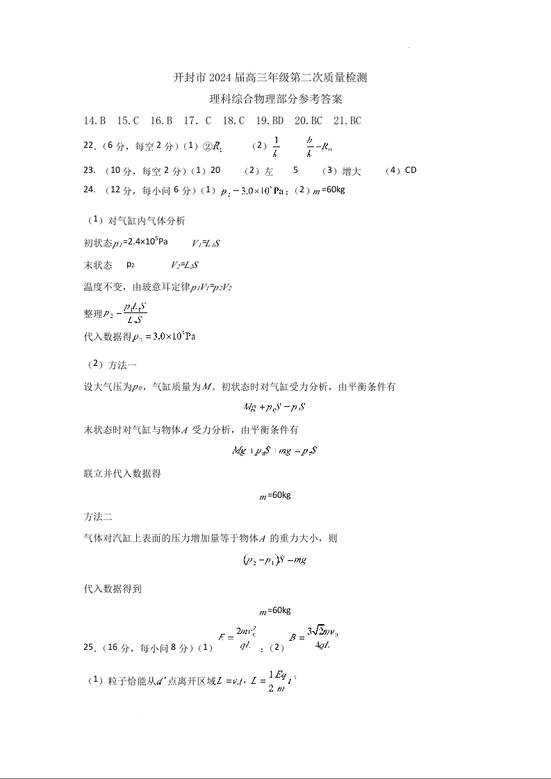 河南省郑州市开封市2024届高三年级第二次质量检测物理答案