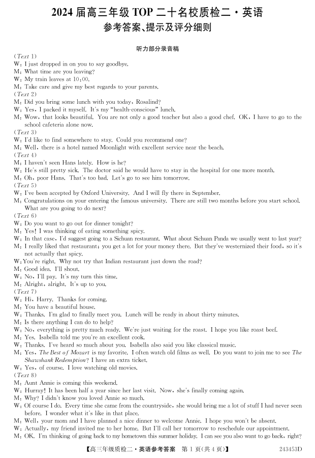 2024届河南省创新联盟TOP二十名校质检二(二模)英语答案