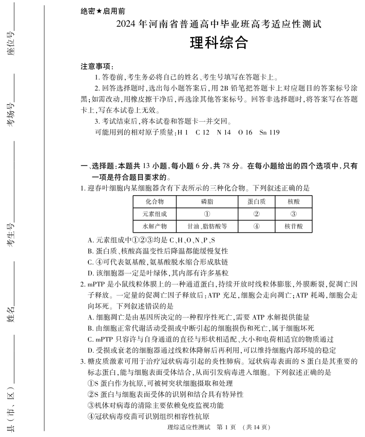 2024届河南省普通高中毕业班高考适应性测试理科综合