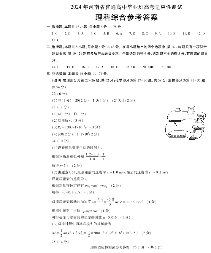 2024届河南省普通高中毕业班高考适应性测试理科综合答案