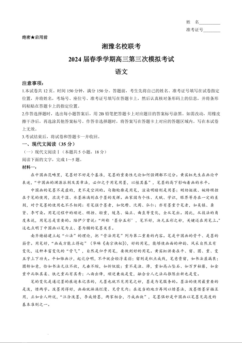 河南省湘豫名校联考2024届春季学期高三第三次模拟考试语文