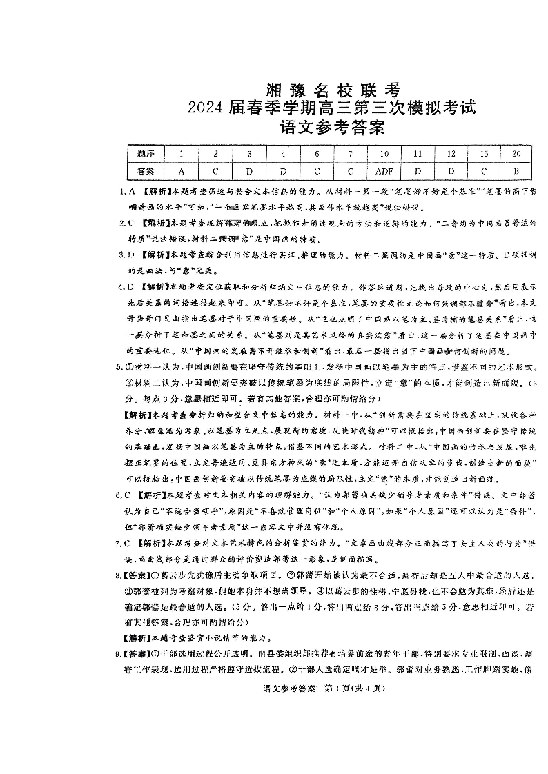 河南省湘豫名校联考2024届春季学期高三第三次模拟考试语文答案