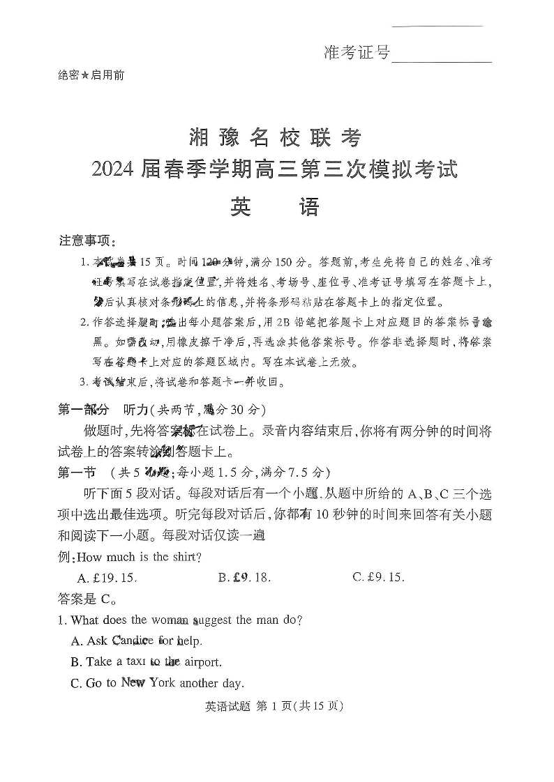 河南省湘豫名校联考2024届春季学期高三第三次模拟考试英语