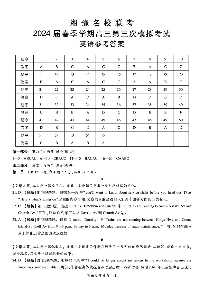 河南省湘豫名校联考2024届春季学期高三第三次模拟考试英语答案